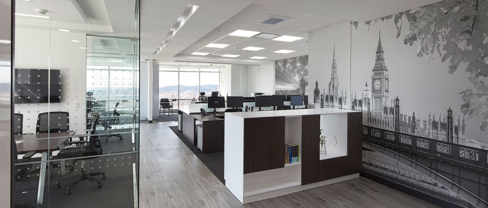 La intervención de la oficina Kennedys law se realiza con base a unos principios y requerimientos por parte del cliente aprovechando su localización estratégica en el piso 28 la cual tiene fachada sur-occidental dándole una vista privilegiada a la ciudad.