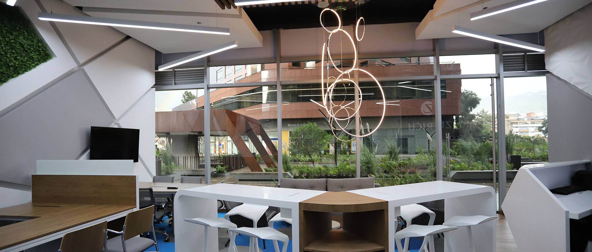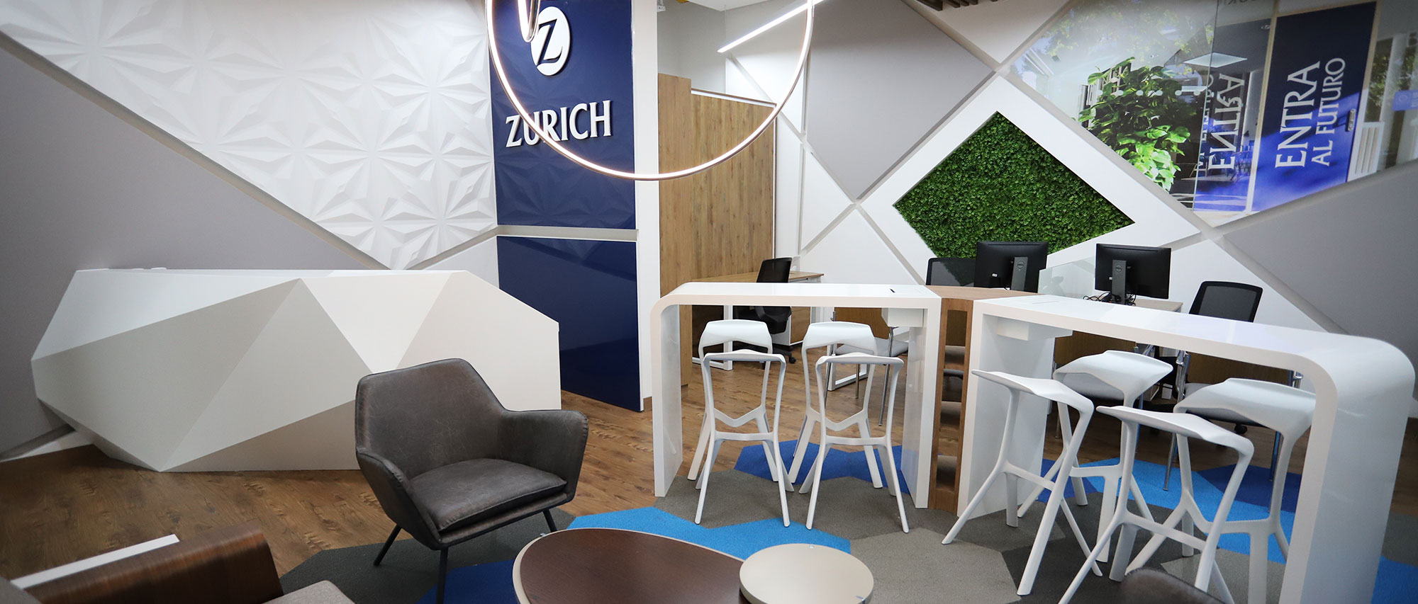 El diseño inspirado en las geometrías de elementos que hacen parte del mobiliario urbano de la plazoleta aledaña, para así mantener un aspecto familiar y se mantenga como una sola unidad, respetando la imagen corporativa y lineamientos que en términos de colores y estética la compañía (ZURICH) exige a nivel mundial de acuerdo a su regulación.